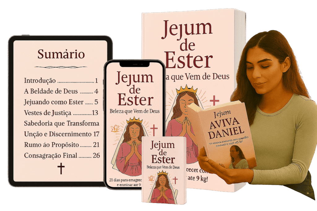 O Jejum de Ester é um programa de 21 dias que une fé, propósito e transformação física, inspirado na coragem e beleza da rainha Ester. Através de um plano espiritual com base bíblica, devocionais diários e orientações para um jejum consciente, você será conduzida a um processo de alinhamento com Deus enquanto cuida do seu corpo, eliminando até 9kg com propósito, leveza e direção divina.